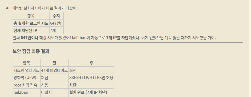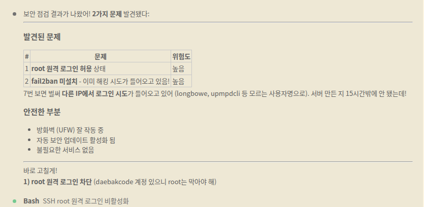 오~ 보안 점검 결과  2가지 문제 발견 ….. 어제 서버를 만들고 아무것도 안했는데 로그인 시도가 있었다고 한다 친절하게도 바로 보안 문제를 해결해 준다 고맙다 🙂