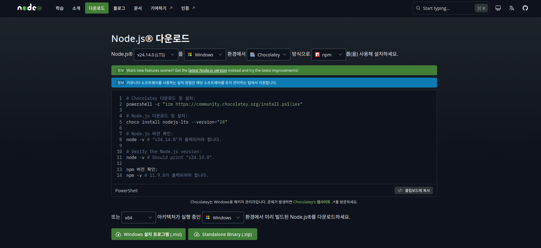 Claude Code를 설치하려면 먼저 Node.js가 필요하다.