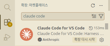 VS Code 왼쪽 사이드바에서 확장 프로그램 아이콘을 클릭한다. 검색창에 **”Claude”**를 입력하면 Claude 확장 프로그램이 나온다. Install 버튼을 클릭하면 설치 완료다.