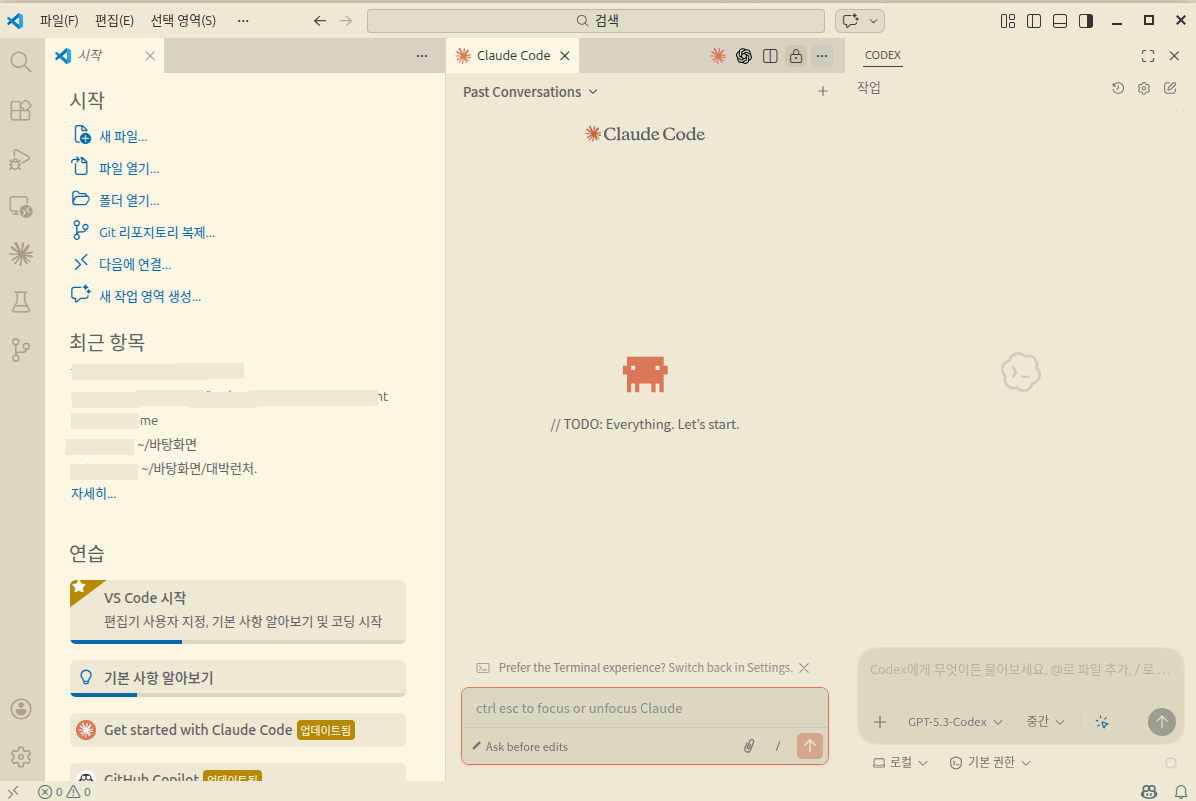 하지만 Claude Code나 Codex를 VS Code에 연결하면, VS Code 안에서 바로 AI와 대화하면서 코드를 수정할 수 있다. 복사 붙여넣기가 필요 없다.